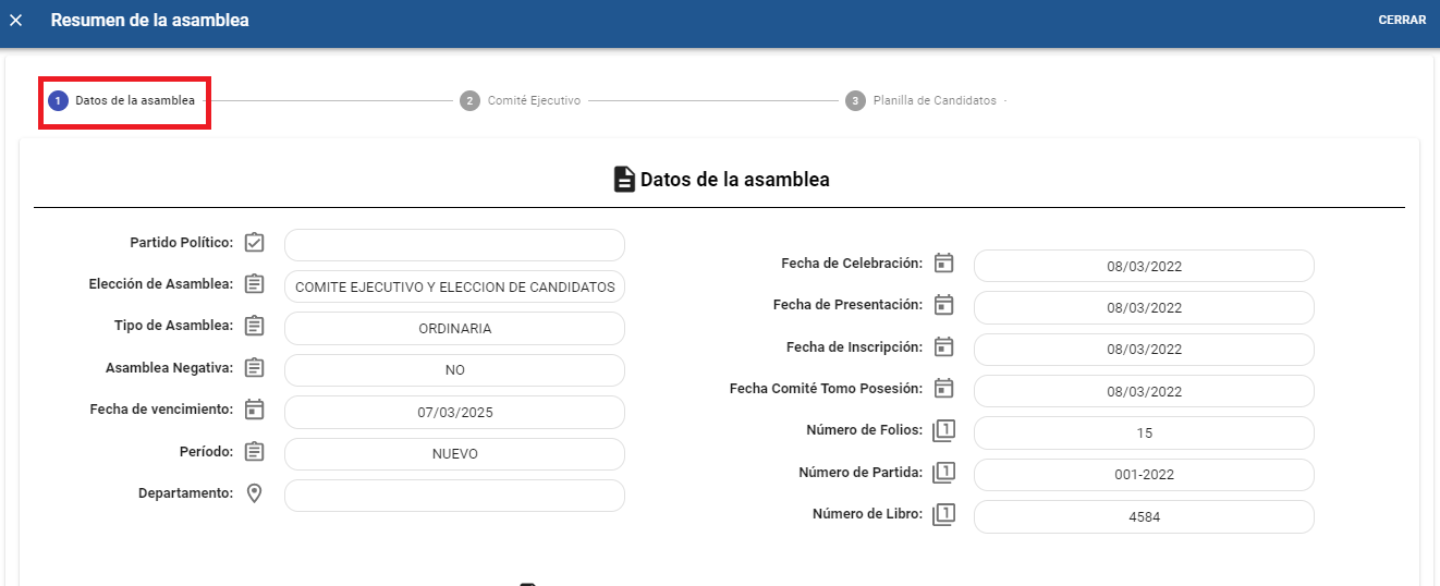 B). Colocarse en la pestaña “Datos de la asamblea” donde muestra el resumen de la asamblea departamental