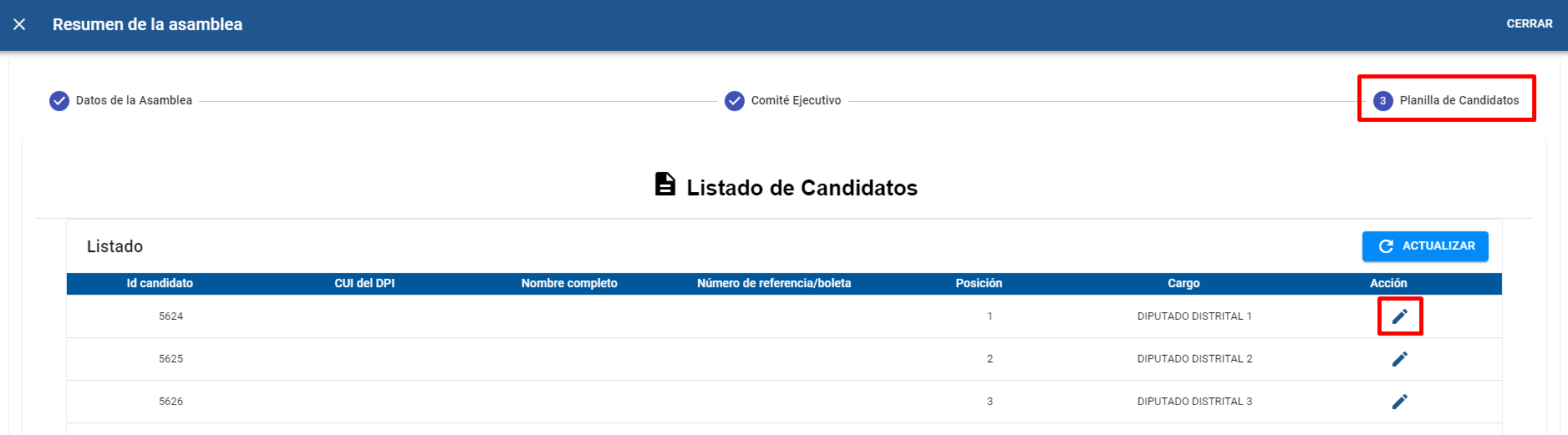 El usuario se dirige a la pestaña “INGRESO DE ASAMBLEAS”, en las opciones que se muestran en la columna “Acción” dar clic en el icono “INGRESAR PLANILLA DE CANDIDATOS” para iniciar el proceso de registro de candidatos departamentales que son Diputados Distritales.