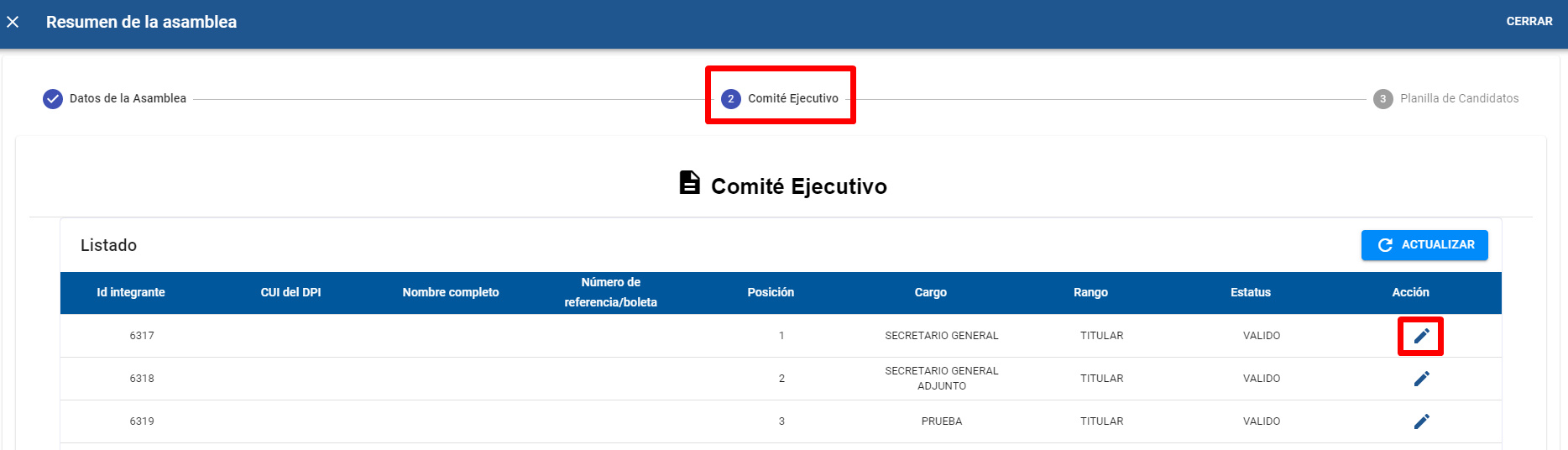 A). Colocarse en la pestaña “Comité Ejecutivo” se mostrara el listado de personas que conforman el comité ejecutivo departamental, dar clic en el icono "Editar datos del integrante del comité ejecutivo".