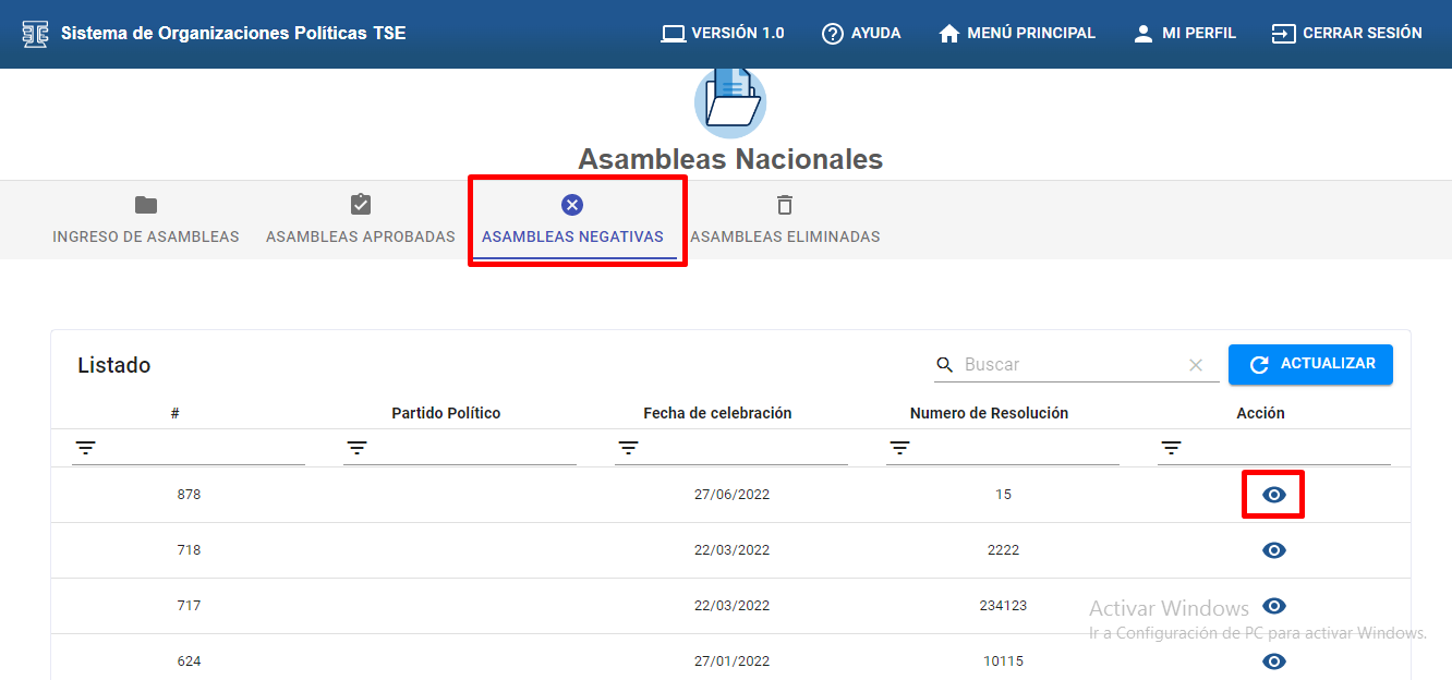 C). Dar clic en la pestaña “ASAMBLEAS NEGATIVAS” donde se visualizan las asambleas que se guardaron como negativas.